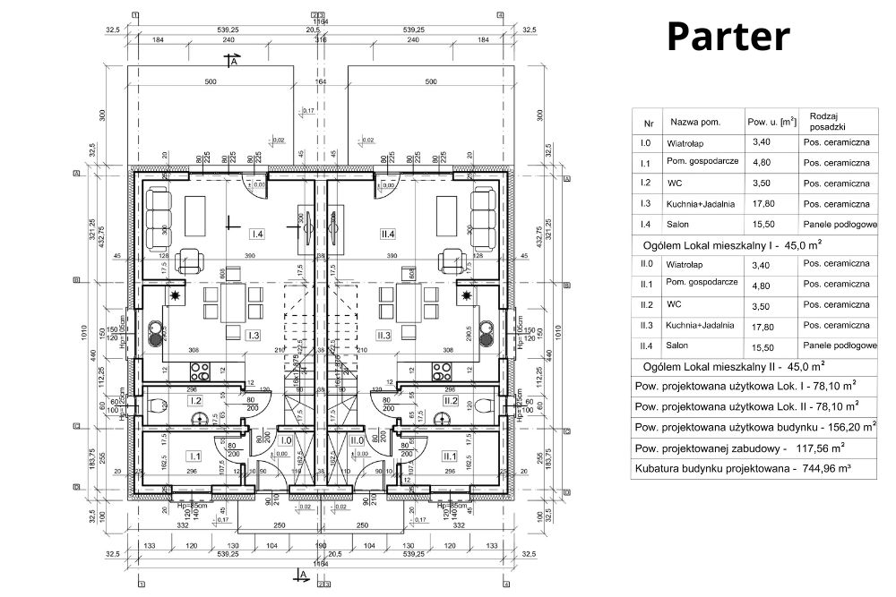 Salon, kuchnia z jadalnią, wc, wiatrołap, pomieszczenie gospodarcze