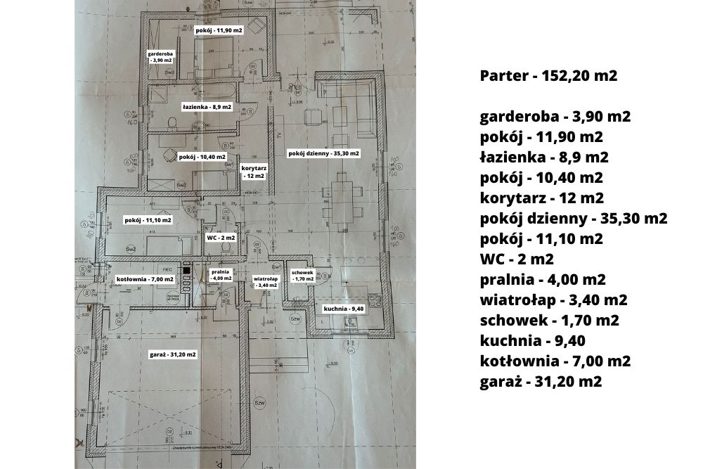 – salon, kuchnia, 3 pokoje, łazienka, WC, garderoba, pralnia, schowek, kotłownia, korytarz, wiatrołap, garaż