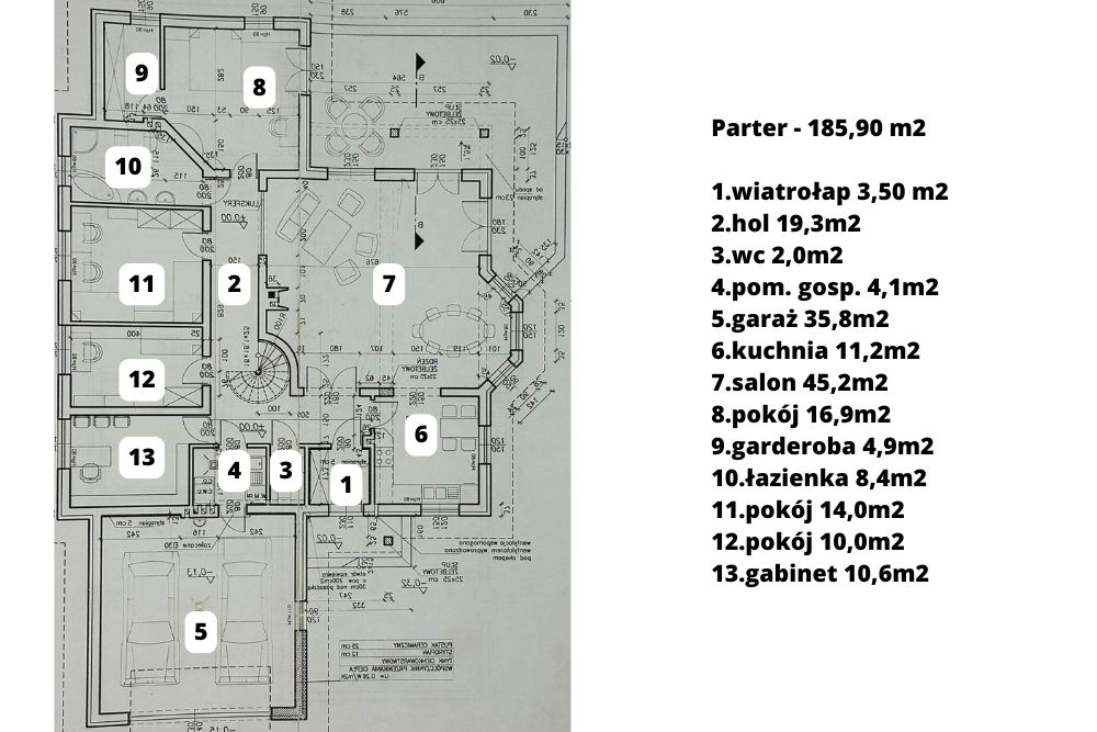 – salon, kuchnia, łazienka, wc, 3 pokoje, garderoba, gabinet, pom. gosp., wiatrołap, hol, garaż + poddasze + taras + kotłownia pod tarasem + pom. gosp. pod tarasem