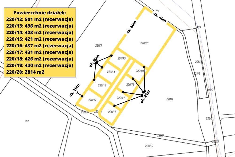 – działka nr 220/12 – pow. 501 m2 – cena 35 000 zł (rezerwacja)